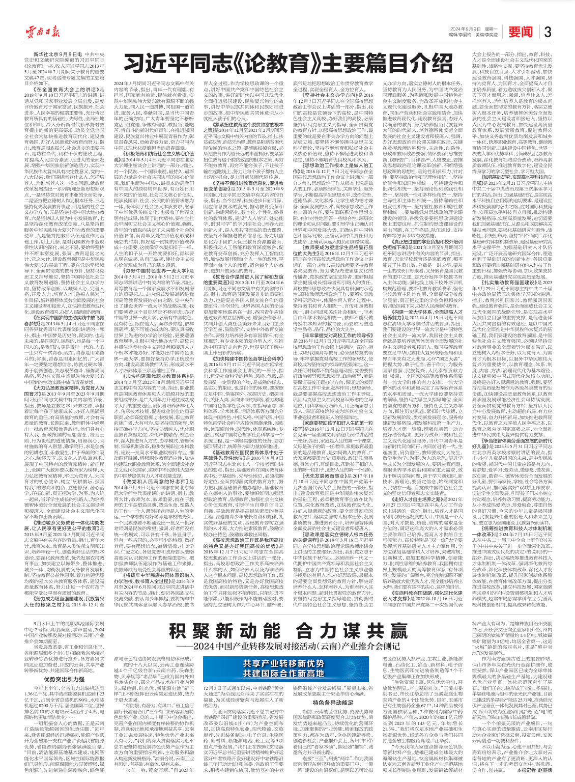 教育是强国建设、民族复兴之基。党的十八大以来,以习近平同志为核心的党中央坚持把教育作为国之大计、党之大计,全面贯彻党的教育方针,作出深入实施科教兴国战略、加快教育现代化的重大决策,确立到2035年建成教育强国的奋斗目标,推动新时代教育事业取得历史性成就、发生格局性变化,教育强国建设迈出坚实步伐。习近平总书记围绕教育发表一系列重要论述,科学回答了“培养什么人、怎样培养人、为谁培养人”的根本问题,深刻回答了新时代新征程为什么要建设教育强国、建设什么样的教育强国、怎样建设教育强国等一系列重大问题,为建设教育强国指明了前进方向、提供了根本遵循。在全国教育大会召开之际,习近平总书记《论教育》出版了。这部专题文集收入习近平总书记有关重要文稿47篇。认真学习这些重要论述,对于牢牢把握教育的政治属性、人民属性、战略属性,加快建设教育强国,为以中国式现代化全面推进强国建设、民族复兴伟业提供有力支撑,具有重要意义。