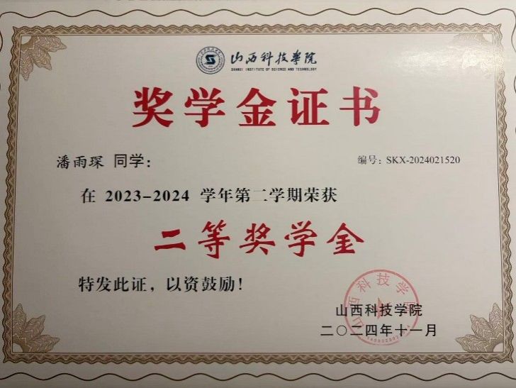 2024年11月,获2023-2024年第二学期二等奖学金。